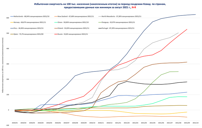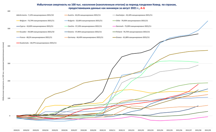 Что мы видим в целом -- низкий уровень тестов - 51% к населению, низкий уровень вакцинации - 22% и разницу между официальной смертностью от Covid и избыточной смертностью в 2,5 раза.