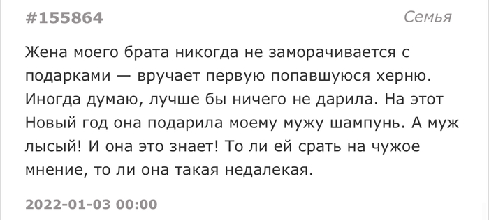 У нас в школе был лысый как коленка трудовик. Не слишком умный и вообще малость нелепый персонаж. Благодарные ученики ему подарили на День учителя шампунь, позже ещё подбросили на стол рекламу Real Trans Hair)))