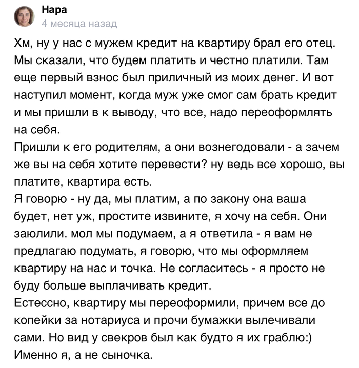 А что им эту квартиру деверь купил, спасибо ему большое, хороший сын, как положено хорошим сыновьями позаботился о родителях. Да и сколько им осталось? Вот они умрут, он все получит по наследству.