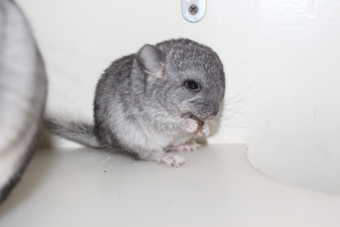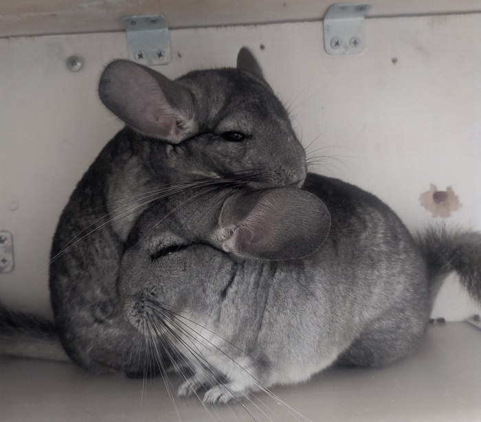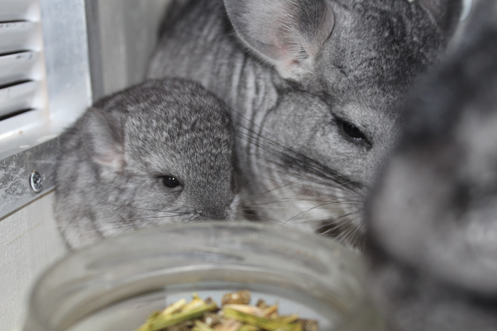 Новорожденные шиншиллы появляются на свет с глазами, зубами и мехом. На второй день вместе с молоком матери точат доски, как взрослые. Отцы шушиков с удовольствием ухаживают за детьми. Мелкого отдали в месяц новым хозяевам.