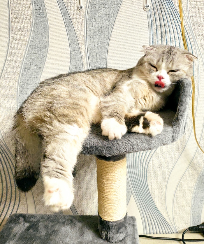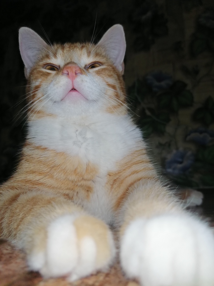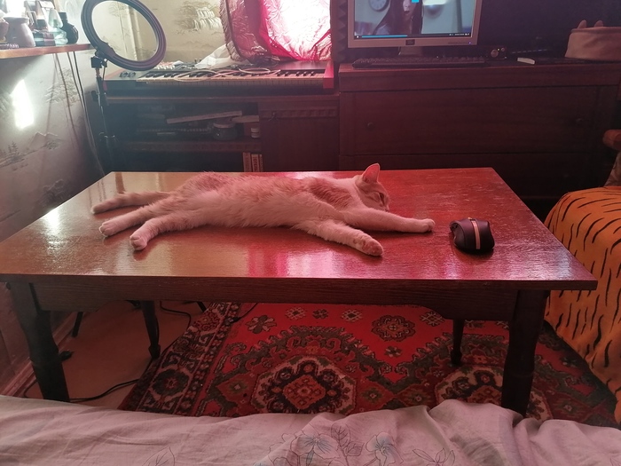 На фото - тихий час после традиционного конского забега по квартире. Можно воспользоваться ситуацией и погладить пузико, но нужно быть осторожным как с бомбой и не забывать: когда играешь с котом, главное - не проиграть, иначе руки будут безжалостно расцарапаны.