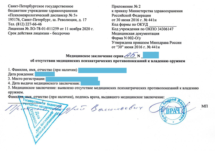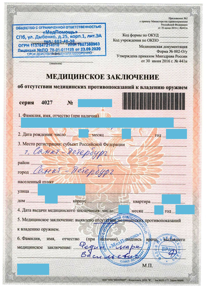 5. С заключениями от нарколога, психиатра и справкой 003-о/у идёте в медицинский центр имеющий лицензию на выдачу справки на оружие (в городской поликлинике по месту прописки), проходите медкомиссию и получаете справку по форме 002-о/у