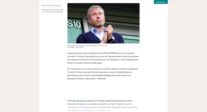Бизнесмен Роман Абрамович, принимавший участие в организации переговоров между Москвой и Киевом, передал президенту России Владимиру Путину записку от украинского коллеги Владимира Зеленского. Об этом сообщает Times.