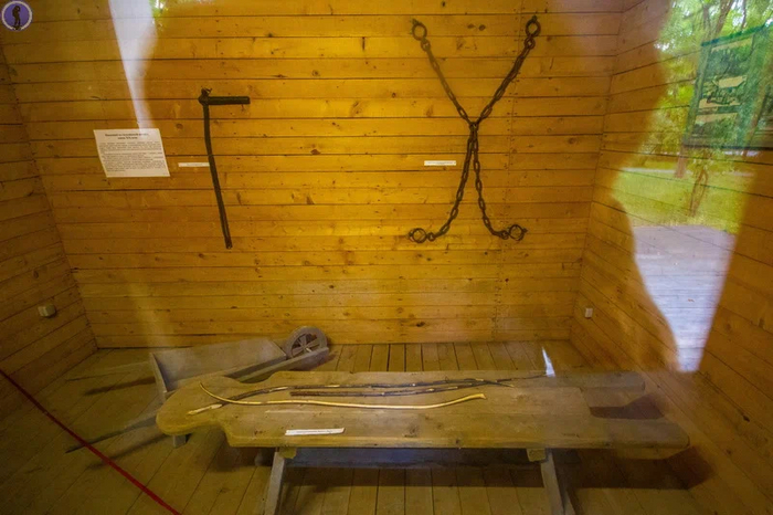 Рядом расположен макет медвежьей клетки, выполненной из сруба. В таких клетках у нивхов и айнов в XIX веке было принято выращивать отловленных в лесу медвежат для традиционных ритуальных медвежьих праздников, во время которых их приносили в жертву языческим богам и съедали.