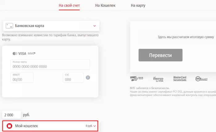 Перевести деньги на прямую через банковскую карту, так же не предоставляется возможным, доступны только два варианта: с номера телефона и "моего кошелька".