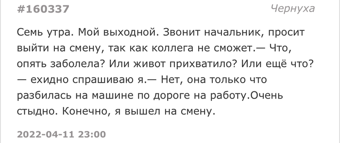 В выходной ждала друга, должен был заехать с празднования дня рождения на погулять пару часов (отмечали недалеко от моего дома), ибо завтра на работу. Не приехал, трубку не берёт. Думаю, ну остался там догуливать. Мог бы и предупредить. Утром его помощь нужна, работали в одной команде, а он на работу не вышел. Я его начальнице набираю, наезжаю «где его черти носят?» Начальница: ты ничего не знаешь? Он в аварию попал, пока к тебе ехал. Водитель их оказался пьян и вылетел в отбойник. У водителя переломы рук, у него перелом ноги и сотрясение, девочка сзади насмерть. Вот уж тут и о работе забыла..