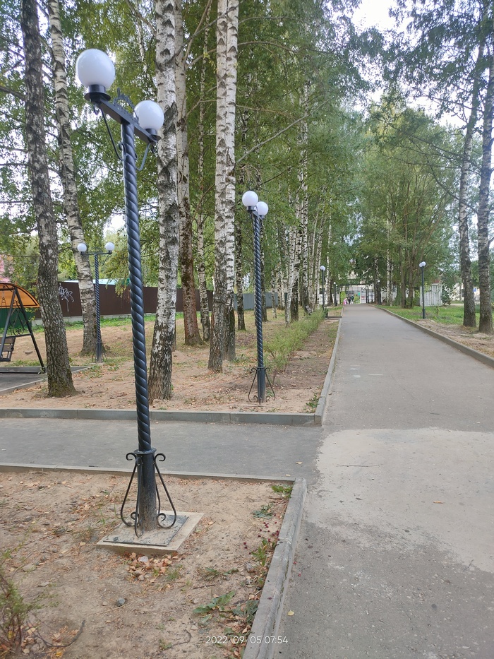Так, большую часть благоустройства видимо закончили. Асфальт не меняли (он норм был), заменили все фонари, поставили новые лавочки, среди них две - качели. Посадили три сосны, 20 кустиков чего-то фиолетового. Какие-то металлические конструкции, может хотят ещё подсветку какую-то сделать, но пока нет. В общем, деревья сохранили, кусты расчистили, фонари и лавки заменили!