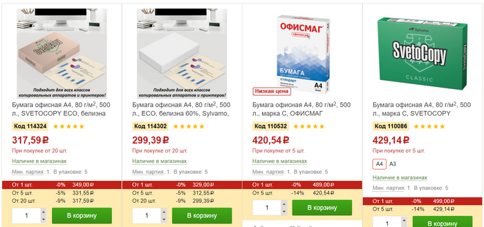 Бонус для паникеров. Бумага A4 (санкционная с желтизной) уже по 299р. на прошлой неделе была по 450р.