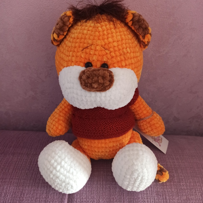 После поста про Егора сердце просто было не на месте. Так хотелось хоть чем-то помочь. А поскольку я очень люблю вязать игрушки, и у меня уже был связан тигр, то мы с ним переглянулись и решили, что он готов ехать к маленькому, но очень храброму мальчику Егорке и быть рядом, и сражаться и бороться вместе с ним и просто быть верным другом.