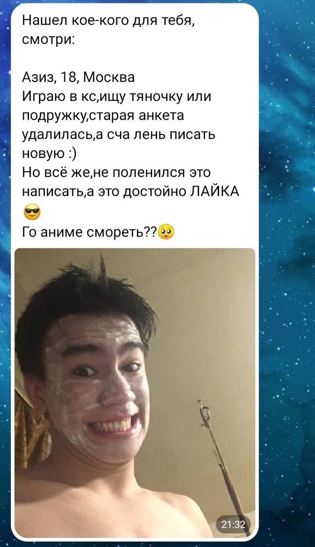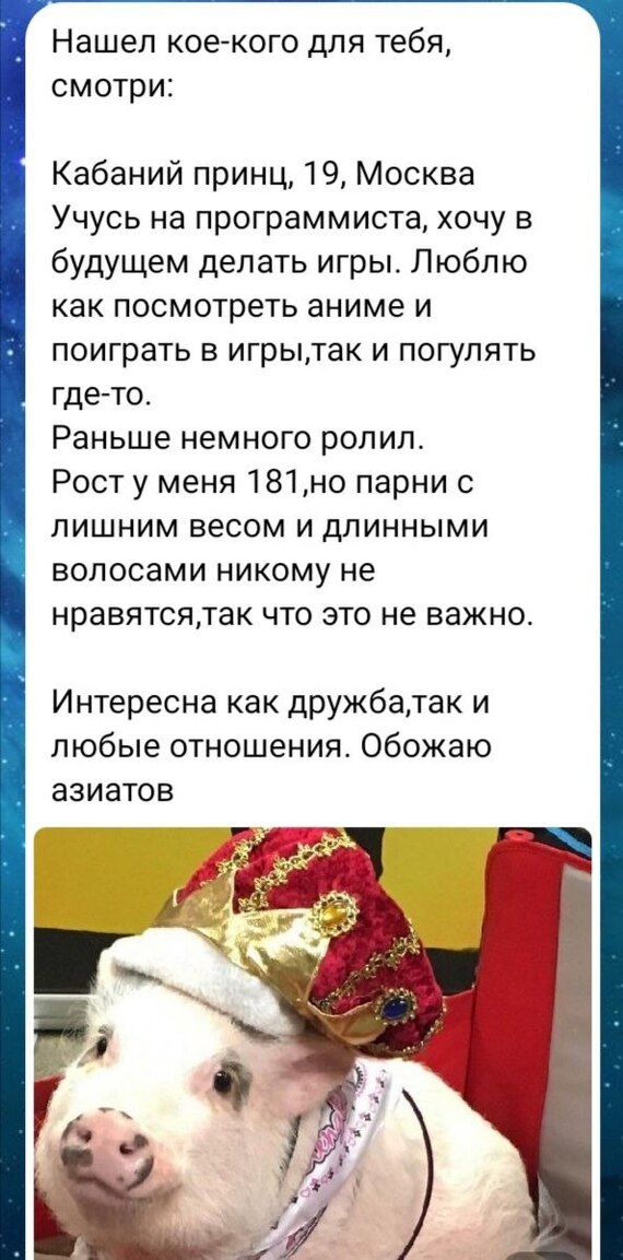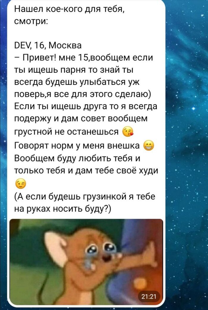 Это не совсем пост-ответ, хоть и связан с аналогом Тиндера. Просто хочу поделиться подборкой анкет из бота ВКонтакте ДайВинчик — аналога Тиндера для людей 18-, в котором я сидела в свои 16-17 лет. С некоторыми из них я даже успела пообщаться, а с кем-то и согласиться на свидание. Худшие чаты в моей жизни...