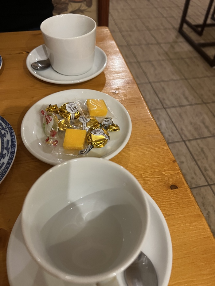 Чай. Обычный чай из пакетика в стакане. К чаю дали ириску в шоколаде из соседнего дикси.