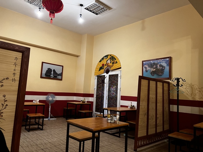 Обычные столы. С клеенками. Обычные, неудобные стулья. На 2-4-6 человек, разделены бумажными ширмами. Столы на 6 гостей с диванами. Посадка максимум человек 30. Может меньше.