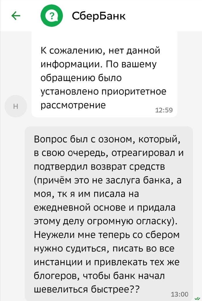 Дальше началось "веселье". Оказалось, что у OZON в принципе отсутствует горячая линия и связь только через мобильное приложение. К слову, добраться до живого человека очень сложно, так как отвечает робот. После моего сообщения перезвонил сотрудник маркетплейса и сказал, что проверка факта мошенничества займет от 1 до 3 дней, после чего денежные средства поступят мне на OZON-счет. Заверил многократно, что деньги точно поступят в течение этого времени и их я могу использовать для дальнейших покупок (ага, с ними связываться и обогащать за счет собственных средств я впредь не намерена) или вывести эти деньги на карту. В чат я отправила все чеки, которые выгрузила из сбера, все реквизиты. То есть со своей стороны я сделала все, что могла, для того, чтобы ускорить процесс проверки.