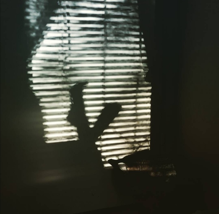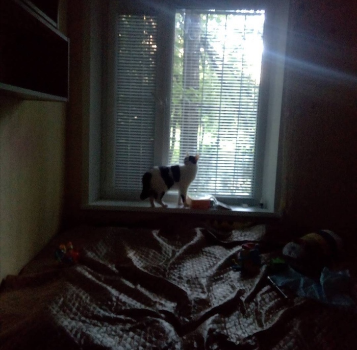 Утром до 12 в солнечный день это выглядит примерно вот так. Солнышко видно где-то за деревьями, но это не спасает. Я специально акцентирую внимание, что жалюзи на окнах слева закрыты, а справа открыты под углом теоретического падения солнечных лучей. Так, чтобы те, кто шароебится под окнами, выгуливая собак, ну или просто всякие дрочеры (это отдельная история) не могли заглянуть в окно снизу вверх, но солнце в квартиру проникало. Вы можете видеть лучик на подоконнике.