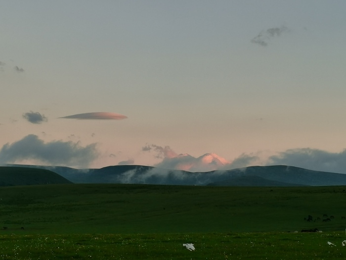Ездили на плато Бермамыт 12 числа и на обратном пути, уже на закате, наконец-то открылся немного Эльбрус. Сделал несколько фото с телефона, а дома рассматривая фото увидел эту фотографию. Облака, Эльбрус на заднем плане, а впереди лежит череп.