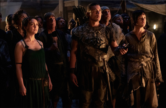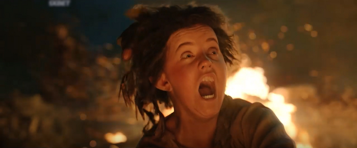 Тут же случается и первый бой сериала – снежный тролль (такие есть в каноне, всё ок), расшвыривает эльфов, но получает валинорской финкой в бок, в грудь и вообще везде, и Гала его добивает. Хоть хореография как в балете, есть и плюсы – кровища льется как надо, а уж когда недобитый тролль начинает жамкать разрубленной надвое нижней челюстью, отчего её куски расходятся в стороны – это мое почтение.