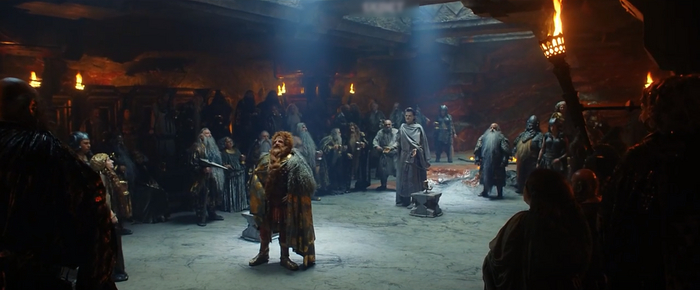 Его доставляют вниз, где выходит Дурин и начинает стебать эльфа. Оказывается, суть ритуала - по очереди хуярить молотом камни, пока один из них не устанет. Ритуал этот был придуман якобы самим Ауле (но этого нет в каноне, поди найди самого Ауле, чтобы спросить). Кстати, что характерно, отсылок к Валар тут куда как больше, гномы не стесняются ругаться типа "БОРОДА АУЛЕ!!!!!11". Эльфа в случае проигрыша - на мороз, в случае победы - одна просьба. Почему "старый друг" положил свою длинную бороду на дружбу, пока непонятно.