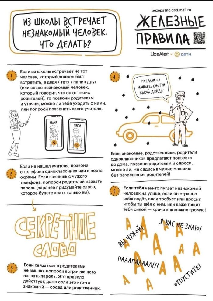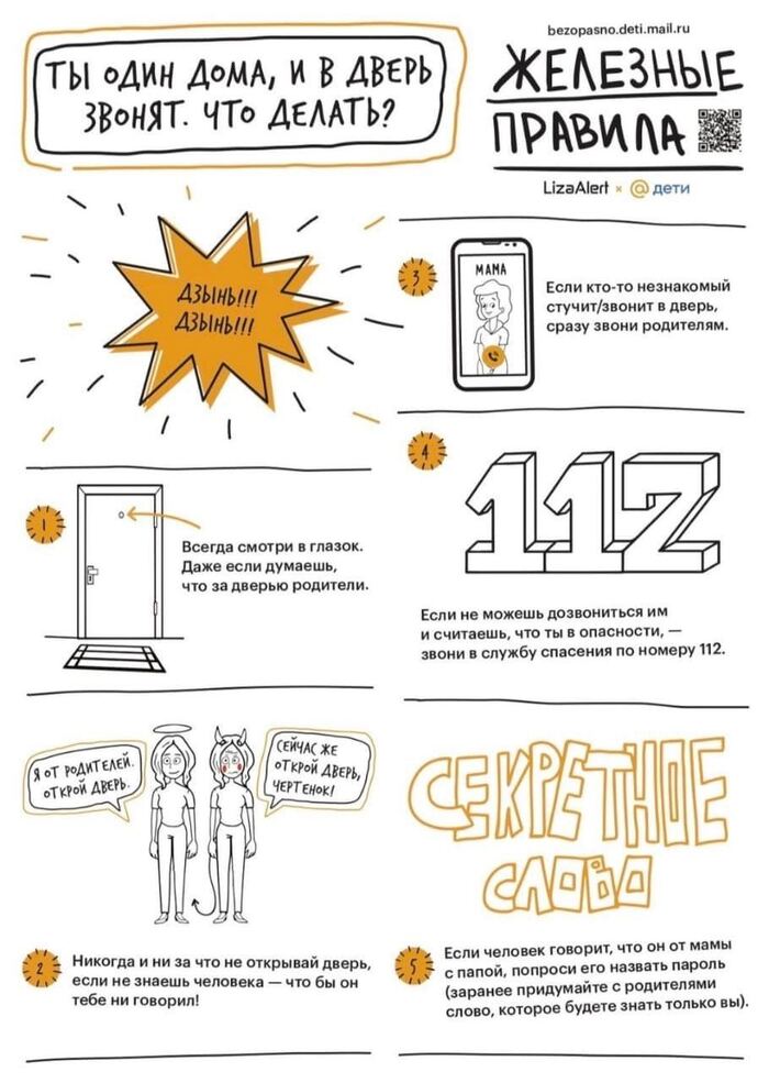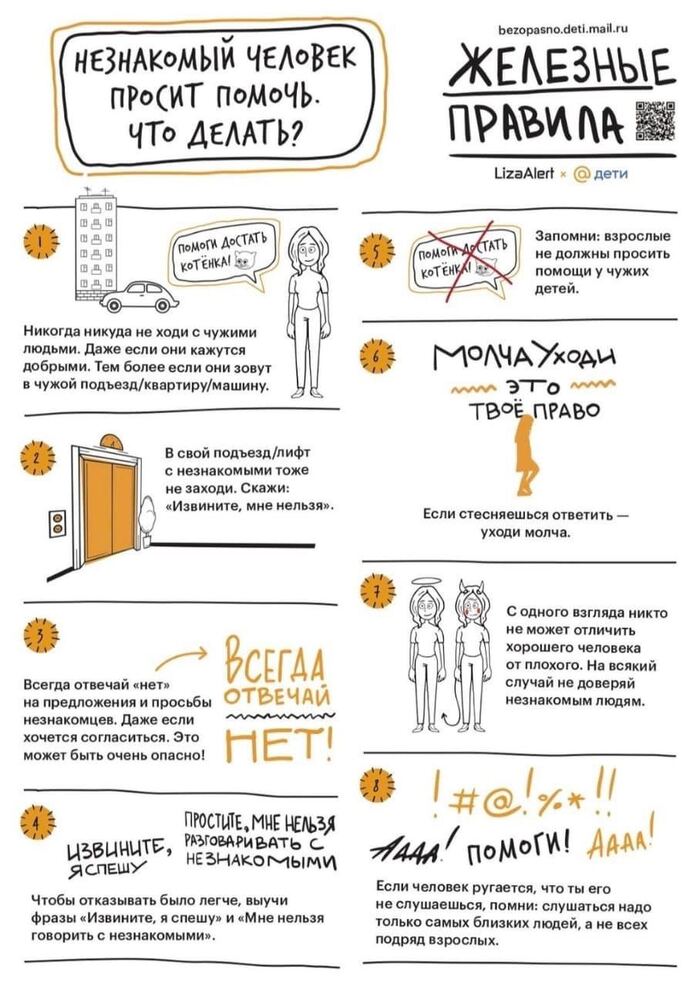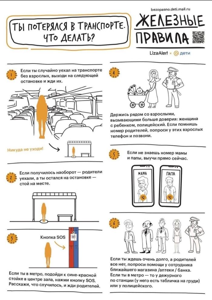 В этих правилах упущен один момент, который сильно облегчит всем жизнь. Расскажу одну историю со службы как раз на эту тему. Служил в росгвардии срочку, патрулировали мы метро. Бесцельно шатаясь по станции, мы нашли потерянного малыша лет пяти. Спросили, где родители, а он плачет, прям рыдает. Дали ему уставных барбарисок, успокоили, дали ПР-ку в руках подержать. Когда ребенок немножко пришел в себя, мы спросили, знает ли он телефон родителей, он не знал. Ну всё, финита, ещё и сниматься скоро, опоздаешь - по головке не погладят, а ситуацию так не оставишь. Осмотрели мы малыша чуточку внимательнее, и тут увидели, что у него к рюкзачку шнурком прикреплен шильдик с номером мамы. Отвели к полицейскому в комнату, потому как телефонов у нас не было, оттуда позвонили его матери и погнали сниматься. Чем история кончилась - я не в курсе, но, раз мы дозвонились, думаю, там таки был счастливый конец.