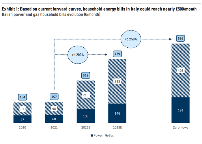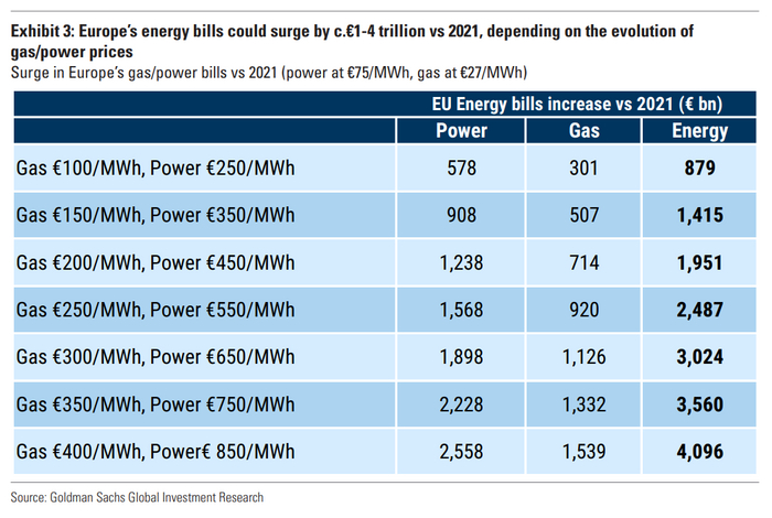 По прогнозу Голдманов, при текущих форвардных ценах счета за электроэнергию достигнут пика в начале 2023 года на уровне около 500 евро в месяц для типичной европейской семьи, что означает увеличение примерно на 200% по сравнению с 2021 годом. Для Европы в целом это означает увеличение счетов за электроэнергию примерно на 2 трлн евро, или примерно 15% ВВП.