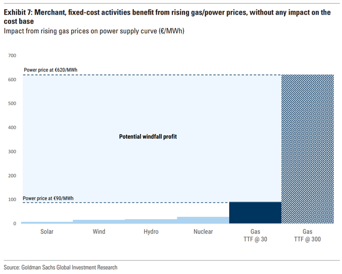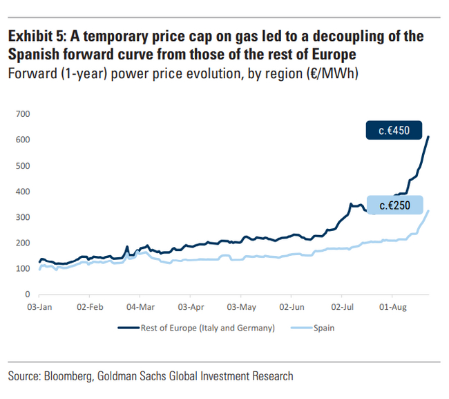 Голдманы делают ставку на то, что будут введены предельные цены на электроэнергию. Государства вмешаются в тарифную политику и введут госуправление тарифами. Введение предельных цен в производстве электроэнергии может сэкономить Европе около 650 млрд евро на счетах за электроэнергию в год. Подобное госрегулирование уже действует в Испании.