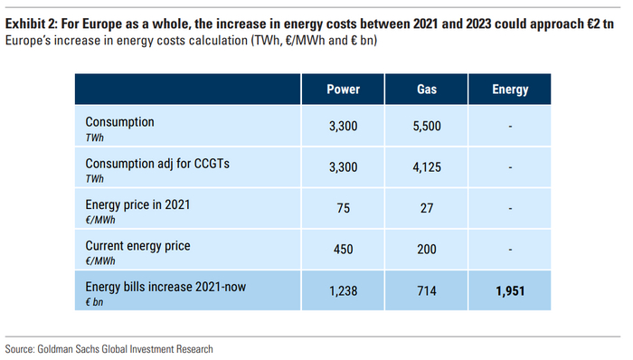 Все жители Европы потратили на счета за газ + электричество в 2021 году 0,95 трлн Евро или 5,5% ВВП Еврозоны. По расчету Голдманов, в 2023 году это будет 2,5 трлн Евро или около 15% ВВП Европы.