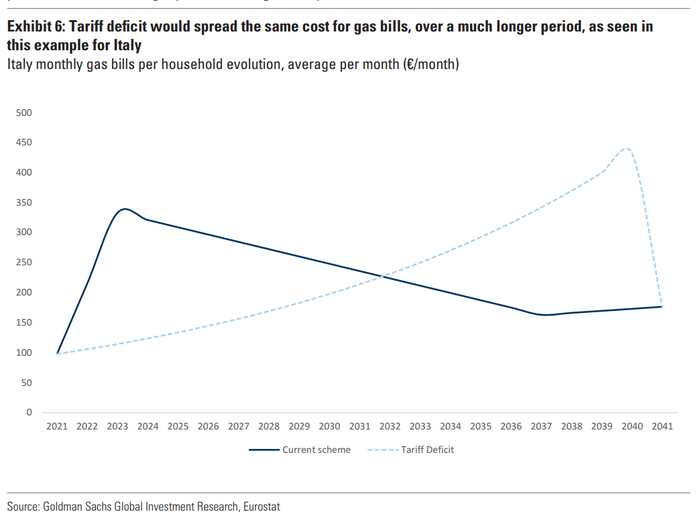 Однако ограничение цен не решит полностью проблему доступности: по оценкам Goldman Sachs, увеличение счетов за газ и электроэнергию все равно составит +1,3 трлн евро, или около 10% ВВП. Вот почему в конечном итоге может потребоваться введение «тарифного дефицита», чтобы растянуть всплеск счетов на 10-20 лет и позволить коммунальным предприятиям оперативно использовать эти будущие платежи.