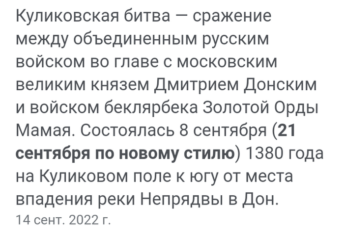 Ну, товарищи, это кому что важнее. Можете отмечать международный день мира, но вообще так-то сегодня годовщина Куликовской битвы. Весьма нихуевого события в нашей истории, и как раз о том, как собраться и выдать всем пиздячек ради будущего народа и выживания.