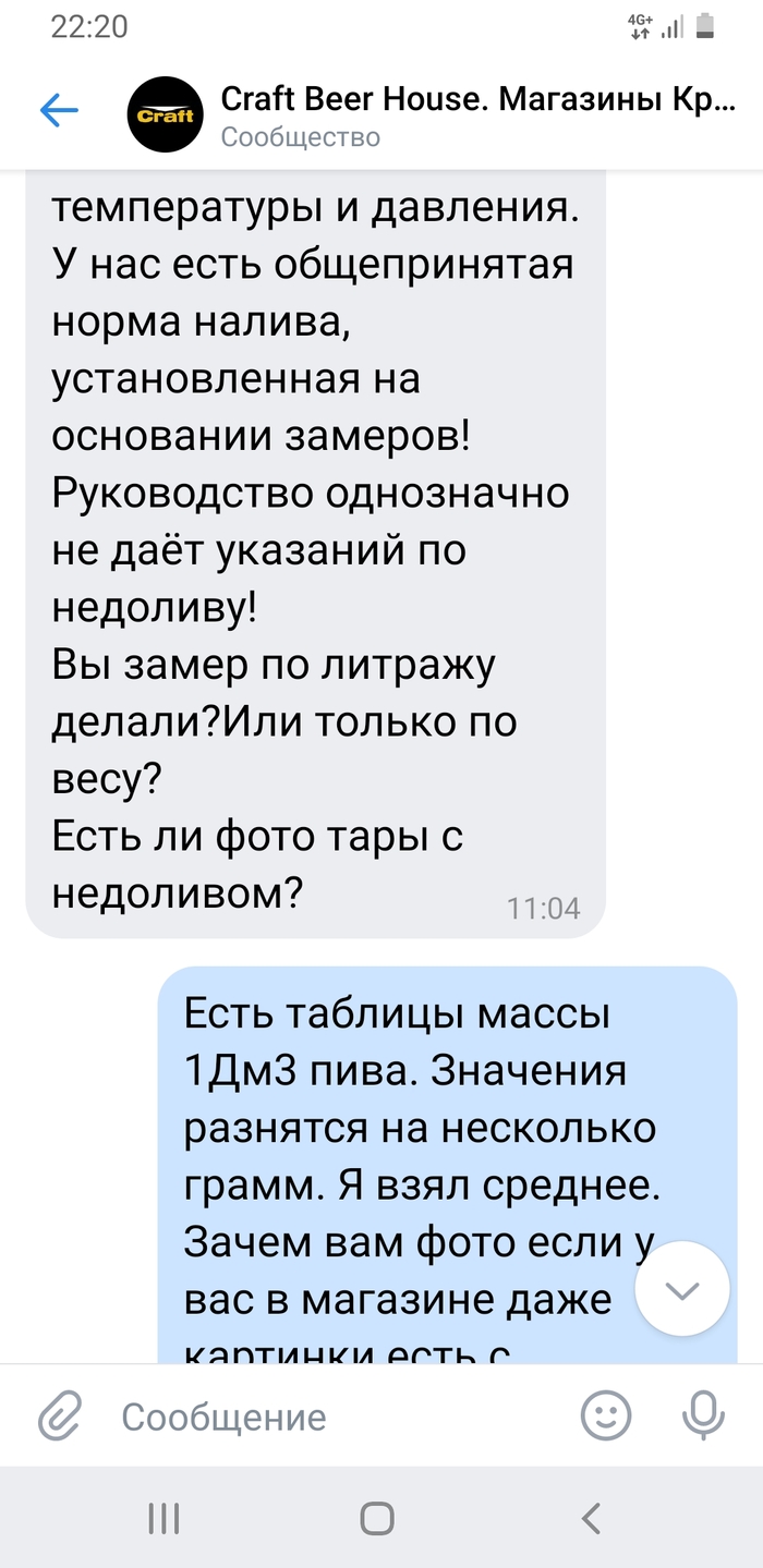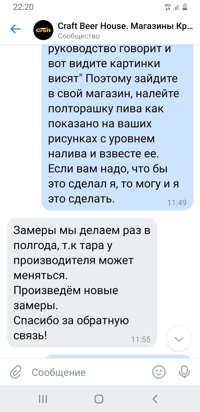 Я давно спорил с продавцами нашего местного сетевого магазина разливного пива о количестве пива налитого в пластиковую бутылку. Ставил бутылку на на весы, доказывал, что в ней налито не 1,5л а 1,45, но продавцам было пофиг. Написал во Вконтакте на страничку магазина и вот...