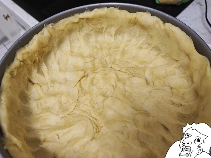 Смешиваем "жидкое" с "сухим" воедино. Можно сначала ложкой, потом уже руками добивать. Лепим тесто. И выкладываем всё это безобразие в форму, формируя края: