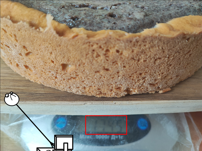 Однако, перед нарезанием пирога я решил его взвесить. Поставил на весы доску, обнулил с учетом её веса и выложил из формы пирог - 1745 гр. (оч-оч извиняюсь за шакальное качество).