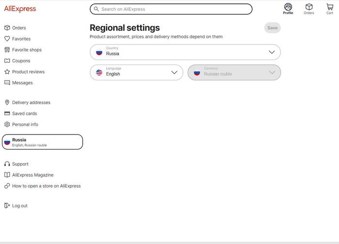 2) Заходя на глобальную версию aliexpress.com (если ру IP - лучше заюзать VPN) меняем сразу страну и валюту на любую не СНГ. И БОЛЬШЕ НЕ ВЫБИРАЙТЕ НЕ ВАЛЮТУ НА СТРАНУ СНГ.