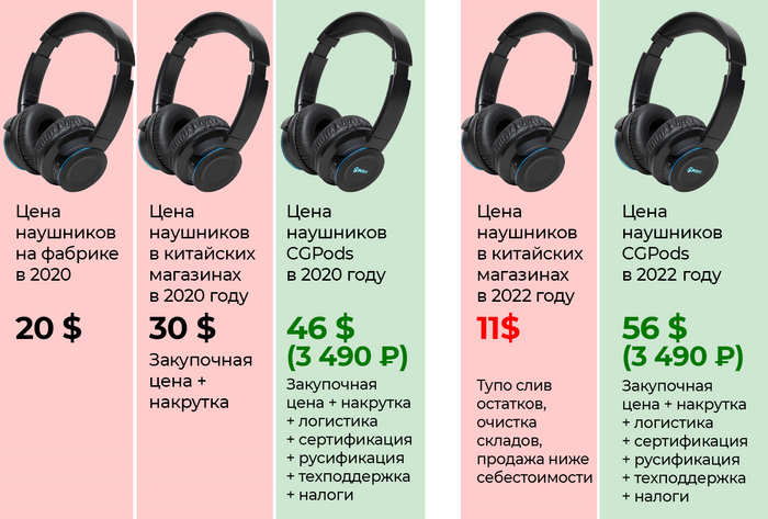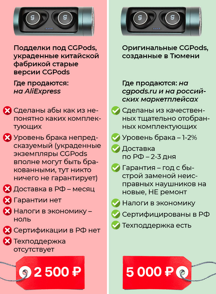 Почему у нас такие цены – объясняет нижеследующая картинка. Во-первых, китайские наушники похожи на CGPods только ВНЕШНЕ, а вот внутренне они совсем другие – гораздо хуже и проще. У CGPods в плане начинки совершенно другой (более совершенный и качественный) продукт. К этой теме я еще вернусь ниже, в следующем разделе. Но есть и другие причины. В частности, если везти товар в РФ, получать все сертификаты соответствия, обеспечивать логистику и гарантию, заплатить налоги, то и цена продукта вырастет. Учитывая все эти факторы, а также существенно более дорогие комплектующие, CGPods будут вдвое дороже, чем похожие китайские наушники.