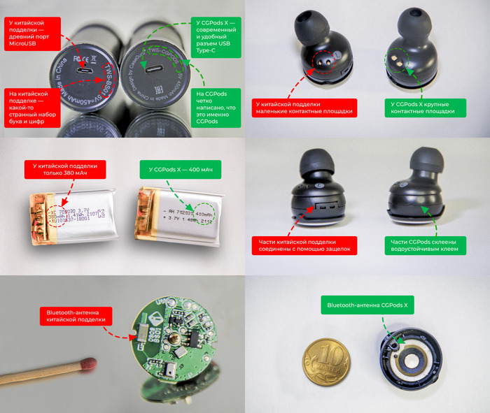 Похожи, да? Да! И почему же было не разобрать именно эту модель, гораздо более современную и актуальную? Неужели потому, что начинка не будет совпадать с китайскими поделками? И тут же по поводу цены: да, разница буквально на порядок. Во-первых, потому, что компоненты – разные! Корпуса – одинаковые, возможно, они с одной фабрики приходят, а вот внутренние компоненты – ОЧЕНЬ разные. Разница в стоимости динамиков, микрофонов, пластика, батарей составляет примерно x3-x5 + налоги + доставка и сервис – и почему готовый продукт CGPods не должен стоить ощутимо дороже такого липового «китайца»? Может. И стоит!