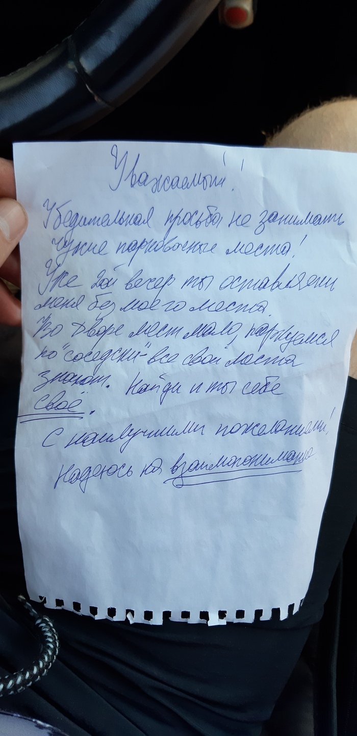 Ночь переночевал, всё нормально, съездил поработать, так же по приезду поставил на то же место, было свободно. На утро обнаруживаю записку от анонимуса