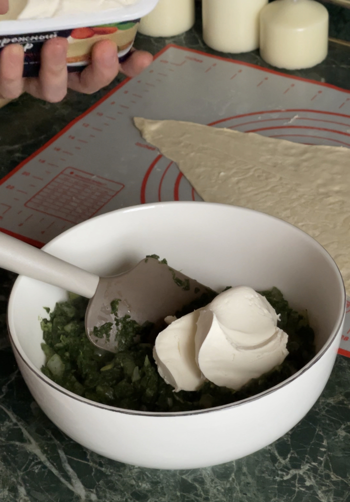 4. Выкладываем шпинат с луком в глубокую емкость, добавляем сливочный сыр, перемешиваем до объединения.