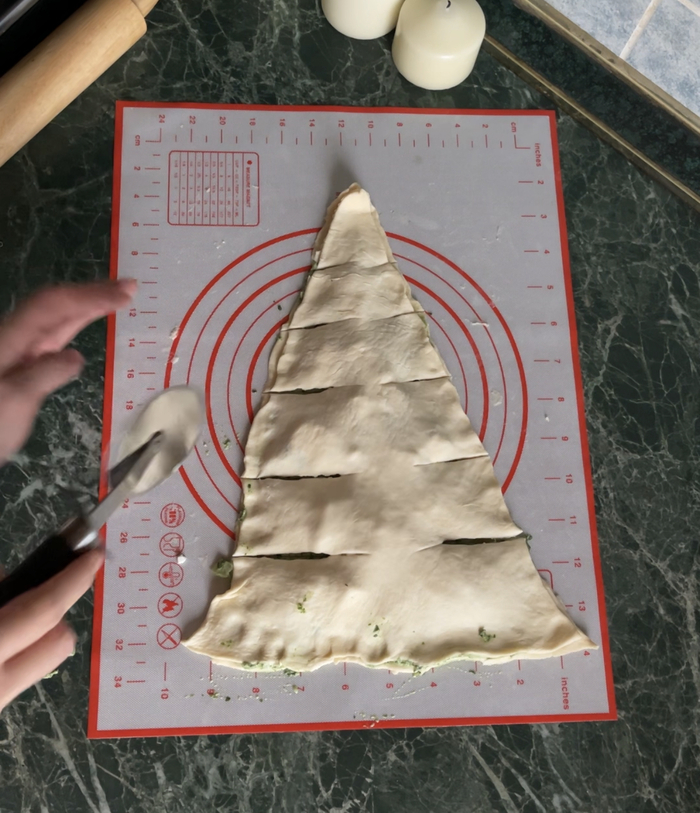7. Закрываем пирог первым большим треугольником.Делаем надрезы ножом. Сворачиваем в направлении от себя каждый надрез.