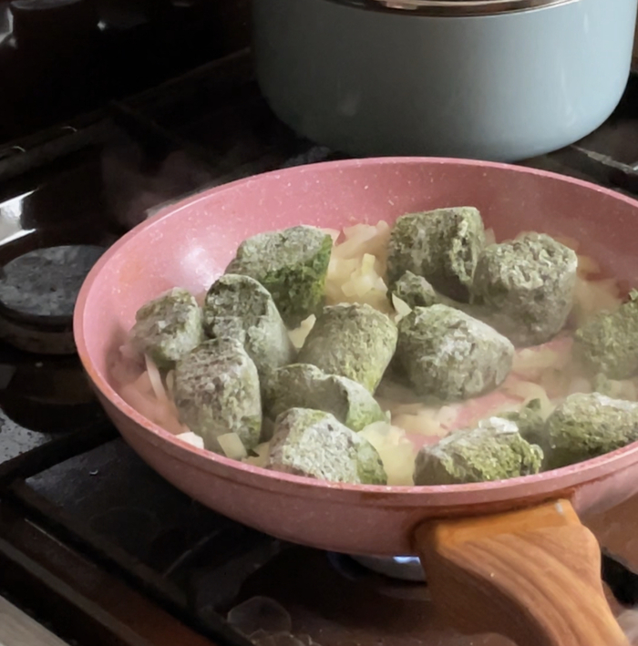 2. Добавляем шпинат (если используете свежий, то его тоже нарезаем), специи.
