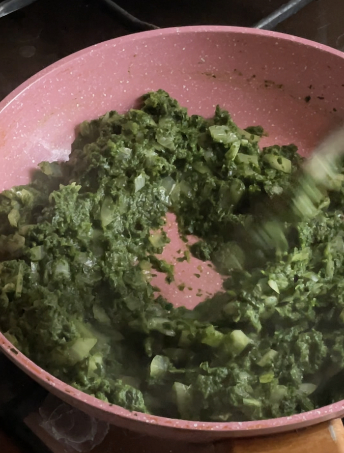 3. Обжариваем шпинат с луком 3-4 минуты до выпаривания жидкости.