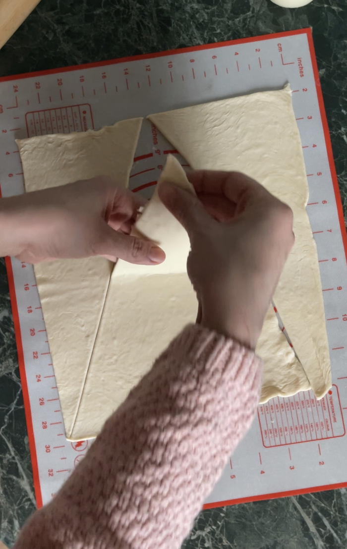 5. На бумаге для выпечки раскатываем слоеное тесто в форме квадрата. На верхней стороне квадрата отмечаем середину. Вырезаем треугольники как на видео.