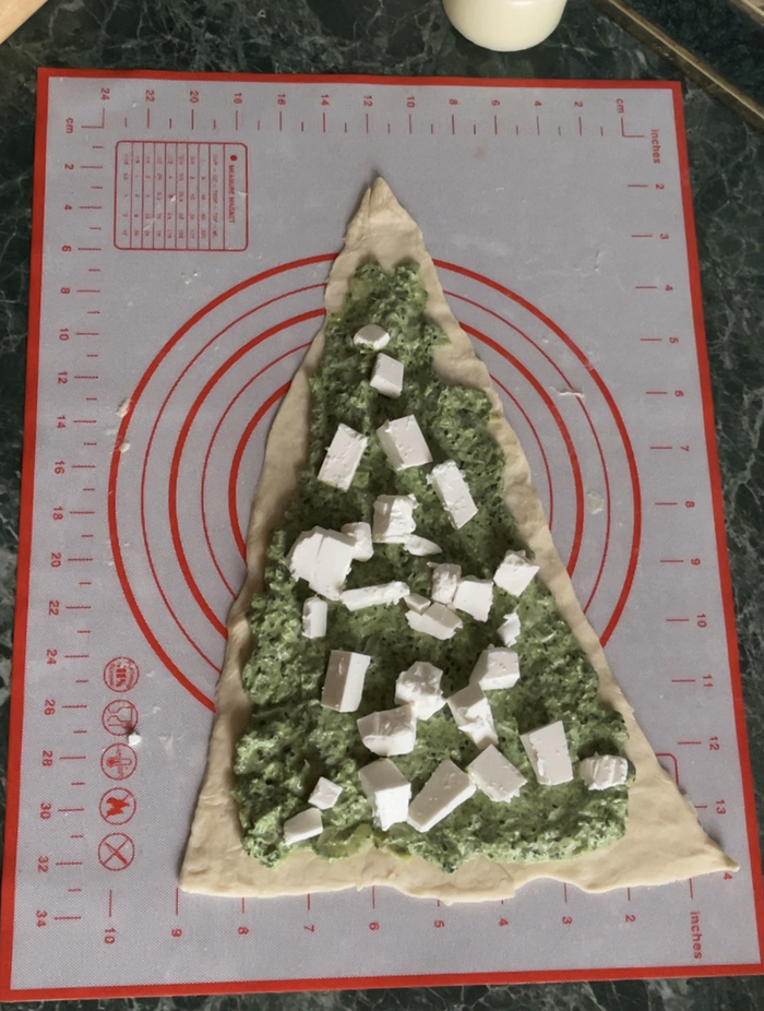 6. Выкладываем нашу начинку со шпинатом.Добавляем фету.