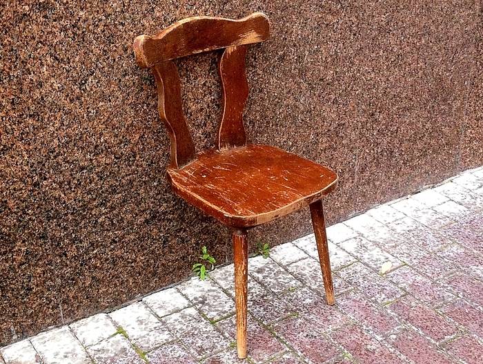 С мастером я встретилась на Алексеевской. Стул, приставленный к стене сталинского дома, смотрелся, как Бонапарт в сожжённой Москве.