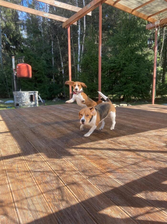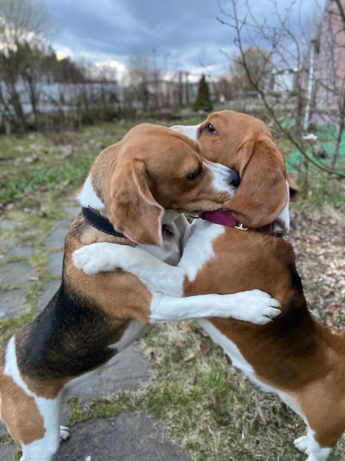Ходили как то в гости к соседскому биглю, тоже девочке. Они любят поноситься вместе, поиграть. Вот примерно так это выглядит.