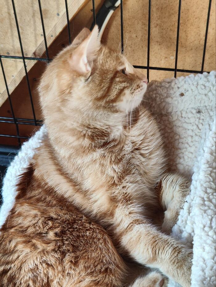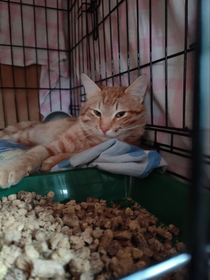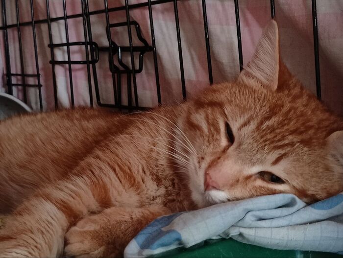Дядя Миша, который спас Фисташку, попросил купить сигарет и я пошла в местный магазин. А там сидит кот, которому плохо. Его подкинули прошлой весной к магазину. Днём его пускают греться в магазин, на ночь, к сожалению, выпускают на улицу. Вчера пришел вот такой, после драки с котом. На ночь тоже планировали выпустить на улицу. Я как всегда, забрала.