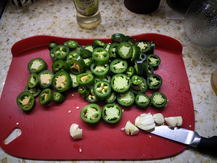 Исходники. Собственно халапешки, уксус, соль, банка, гвоздики, чеснок и мёда немножечко - ну пара блин ложечек. Сахар забыл, но душой он с нами.
