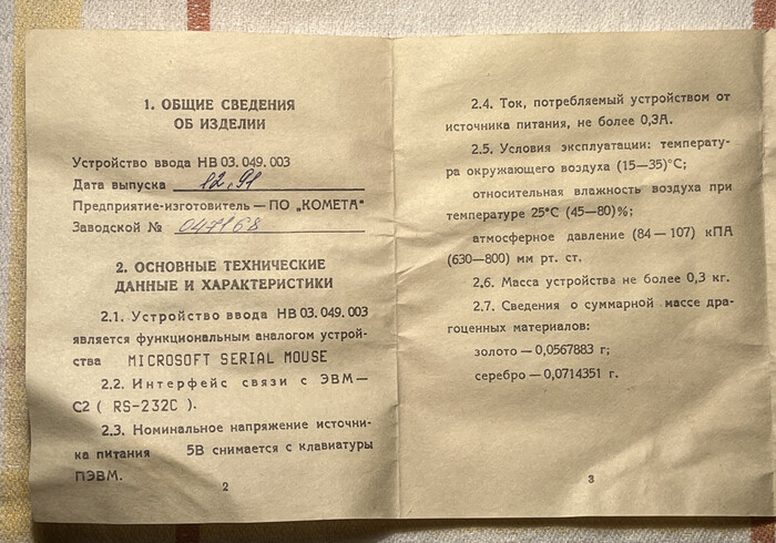 Официальное название — «Устройство ввода НВ 03.049.003». Выпущенное в 1991 году промышленным объединением «Комета», данный манипулятор иногда называют по наименованию производителя — «Комета», а еще в силу округлой формы — «Колобком». Подчеркну, что это неофициальные, «народно-обиходные» названия, и в паспорте устройства этих упоминаний нет. Но мне нравится название «Колобок»; думаю, в современном мире производитель вполне сам бы мог дать такое яркое название своему продукту. С другой стороны, зачем всё сворачивать к игровой форме? Строгое «УВ НВ 03.049.003» отражает серьёзное время. Вот прилагаемый изготовителем паспорт, я приведу его полностью.