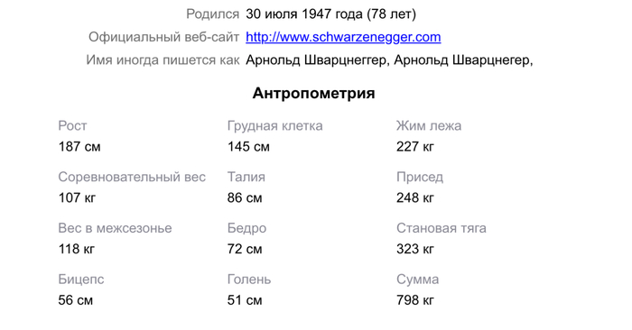 В период максимальной соревновательной формы, Арнольд Шварценеггер весил около 105-107 кг, имея рост 188 см. При этом его объем грудной клетки достигал 145-147 см, бицепсов — 56-57 см, а талии — 86 см