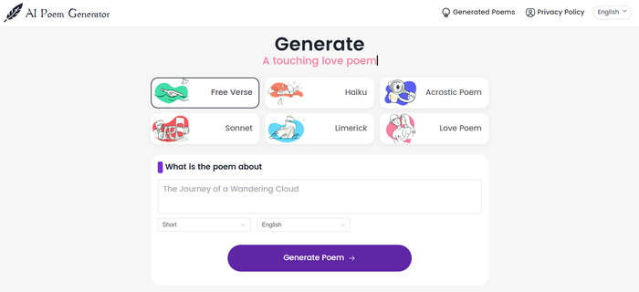 AI Poem Generator — нейросеть для написания стихотворения предлагает формы, настроение и схемы рифмовки.