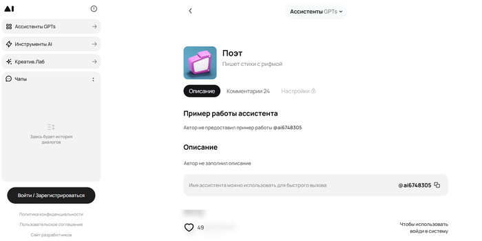 Возможности: генерация стихов с рифмой, каталог ассистентов, выбор LLM из 100+ моделей, создание и настройка собственного ассистента, API и бизнес-аккаунты