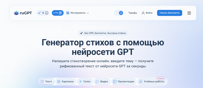 Возможности: генерация стихов по теме, выбор рифмы/стиля/настроения, продолжение стихотворения, подбор рифм, работа в экосистеме инструментов