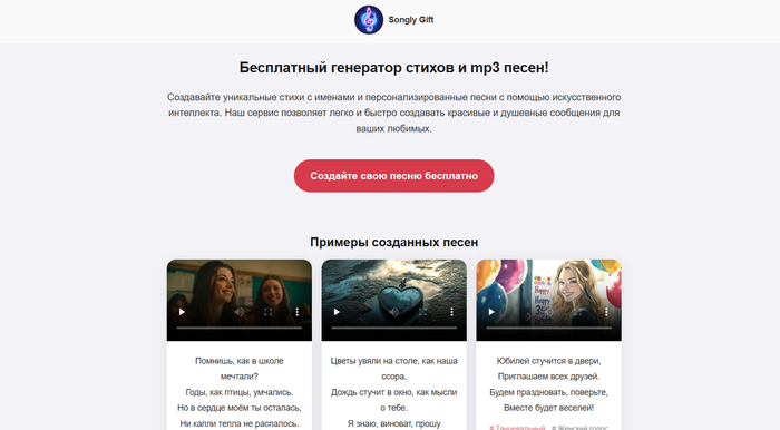 Возможности: персональные стихи с именами, генерация MP3-песен с вокалом, тематические шаблоны (день рождения, любовь, свадьба), тексты песен по идее, инструментальная музыка без слов, веб и мобильные приложения